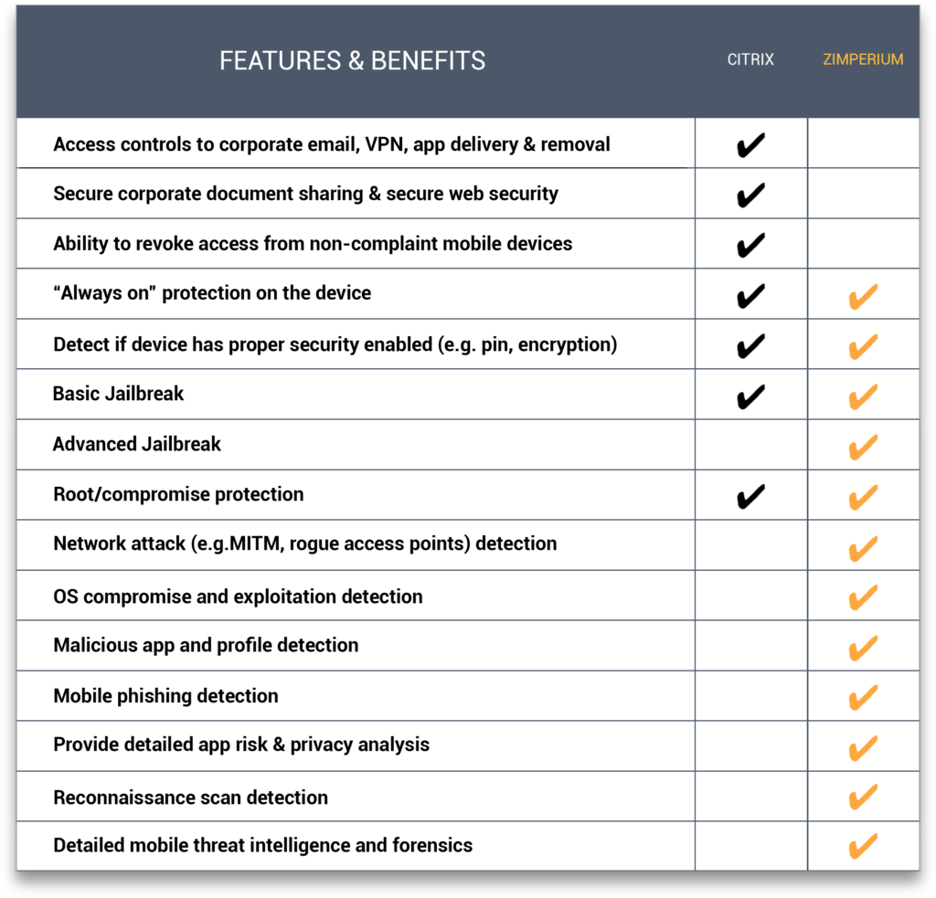 Citrix and Zimperium integrated solution table provides a detailed view of which functions reside in each solution. You already manage devices and access today with Citrix but need to protect your mobility programs from cyber attacks and OS vulnerabilities.