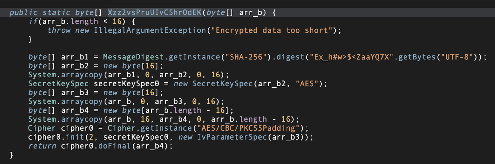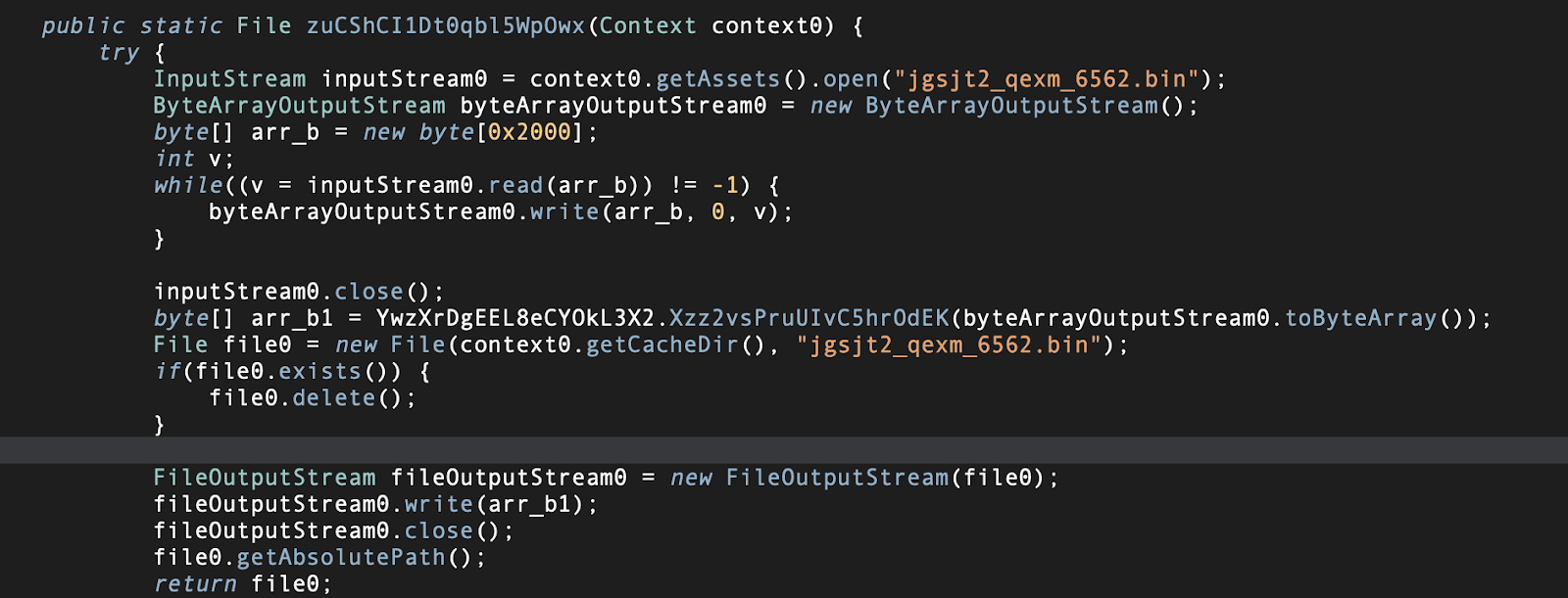 The malware employs a dropper technique, like its predecessor, to bypass Android restrictions. The payload is stored in the assets folder (Fig. 2) in an encrypted format. During runtime, it uses AES/CBC decryption to unpack itself using a key embedded in the code itself.