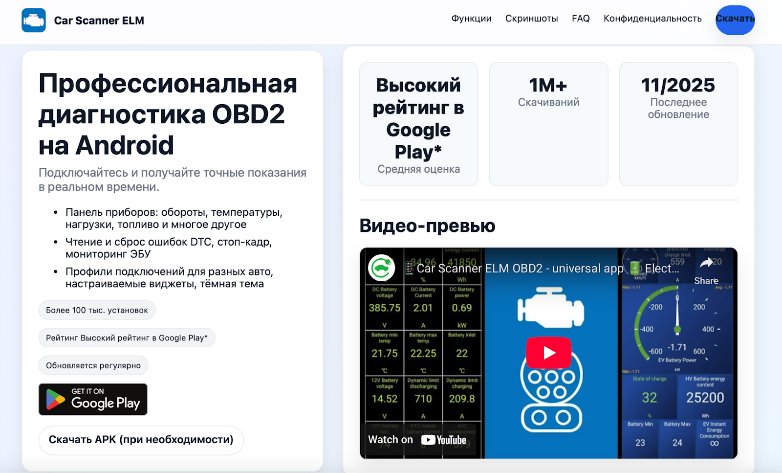 The malware was observed actively hosting over 25 fraudulent phishing domains. Among these were sites impersonating platforms like YouTube and another mimicking a car scanner application, Car Scanner ELM, which is typically used for real-time monitoring, reading, and clearing of diagnostic data via a car's OBD2 port (Fig. 1).