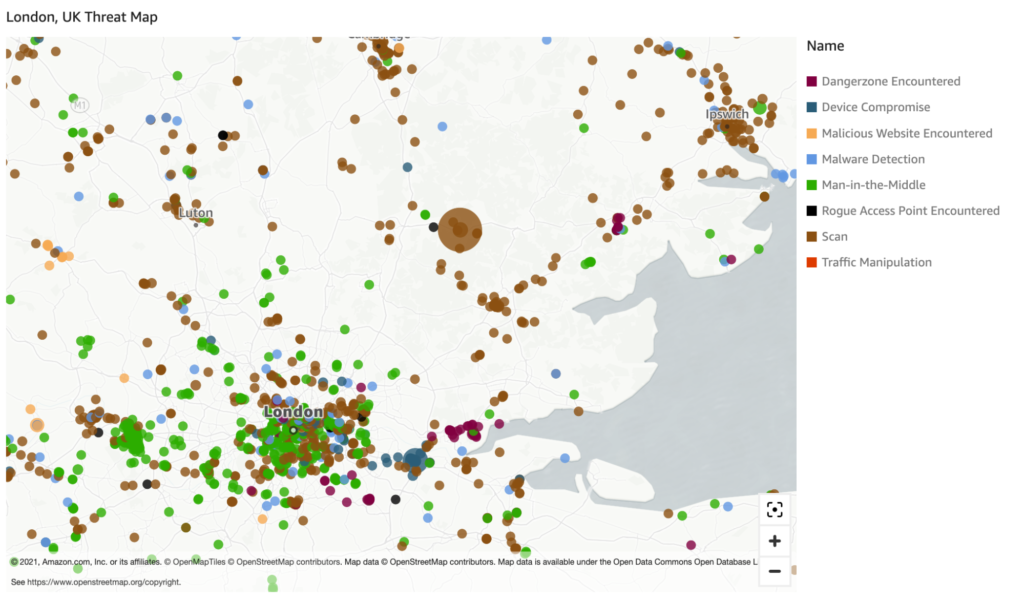 In London, there’s a very high percentage of man-in-the-middle attacks, which are a common way attackers try to gain access to a target network. We’re also seeing a lot of incidents of scanning, which most likely means attackers are trying to gain intelligence for waging upcoming attacks.