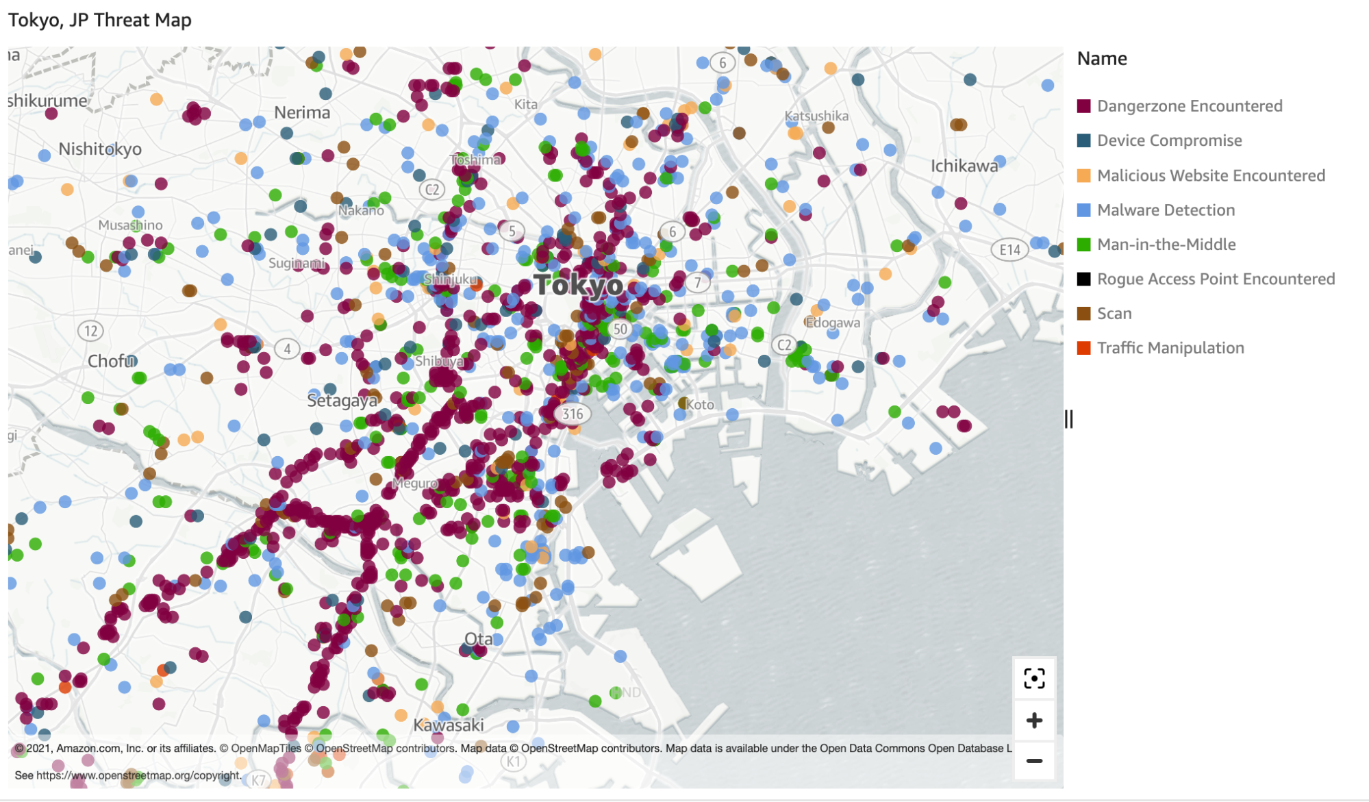 A striking pattern emerges in mapping out threats and attacks in Tokyo. The city’s mass-transit-reliant population is being exposed to danger zones along train lines. Both known and unknown malicious networks can cause these danger zones. In prior months, we saw a lot of scanning. Now, this region is witnessing malware, rogue access points, and man-in-the-middle attacks.