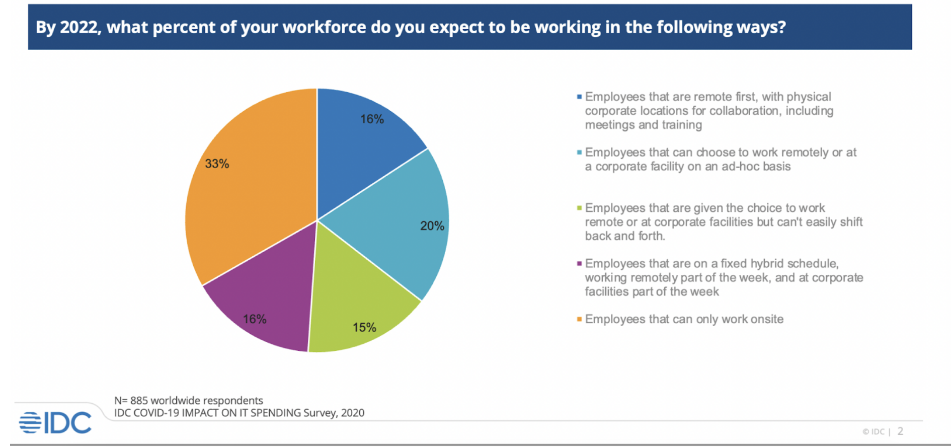 According to the research, a majority of enterprises going forward will be adopting some form of remote or hybrid work styles. In their survey asking professionals what the next 12 to 18 months looked like, IDC found that only 33% of workforces plan on being onsite only. The other 67% of workforces plan on either dedicated remote or hybrid work environments. But this latter approach to working introduces issues and challenges to most of the existing security technologies adopted by enterprises.