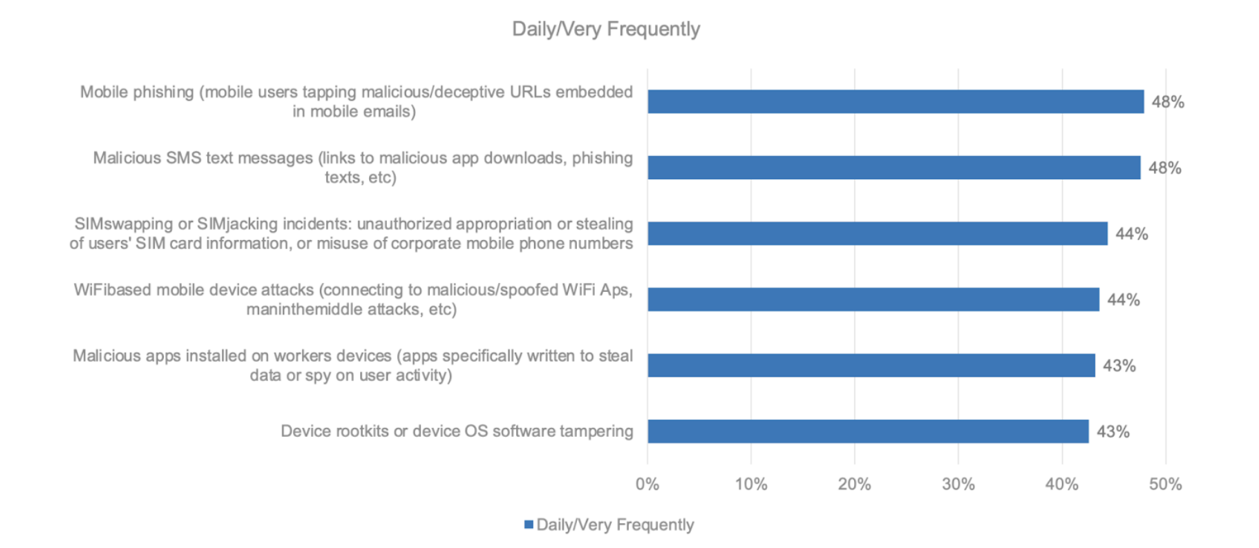 This large gap in security spending also increases the risk of mobile use overall. The shift to remote and hybrid workforces has further complicated security on all endpoints. While traditional endpoints do receive a lot of security focus, cyber criminals are targeting all devices looking for the path of least resistance. While traditional and mobile endpoints are accessing the same critical data, the large gap in security adoption between the two is painting an easy target for malicious actors.