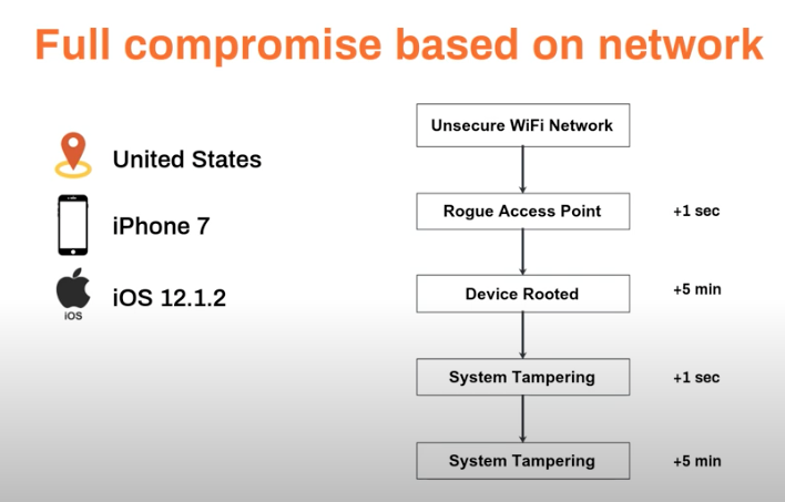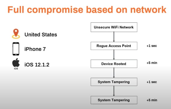 In this example, an individual connected to an insecure Wi-Fi network with a rogue access point. The device is rooted, which enables multiple cases of system tampering. For example, a file system can be remounted, enabling an attacker to gain a persistent presence on the device. Alternatively, a file system may be modified in a way that it shouldn’t be.