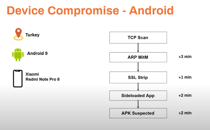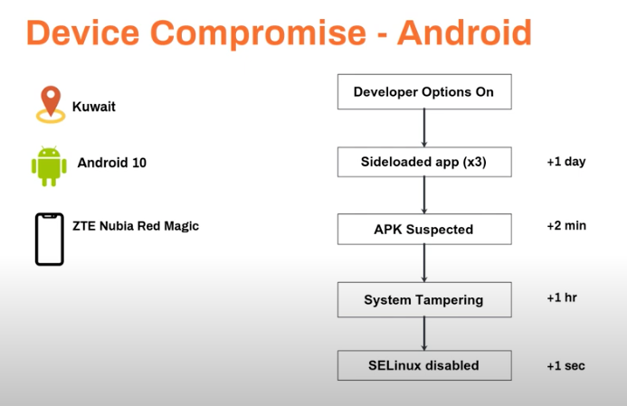 In this case, a user compromises their own device without knowing. The individual has developer options turned on, and within a day, we see several applications sideloaded. Within an hour, we see that there is evidence of system tampering. Ultimately, SELinux, a security module for Linux systems, is disabled, meaning the device isn’t protected from a range of additional threats.