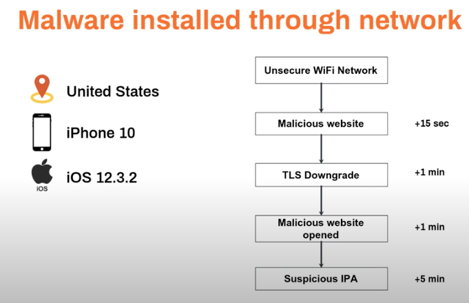 The device operating in an insecure network is directed to a phishing site. Next, we see the device’s TLS requirements disabled, which means unencrypted traffic can be accepted. This means anything entered on the site, whether credentials, personal information, payment card details, and so on, will be visible. Finally, we see that the user actually installs a malicious iOS application on their device.
