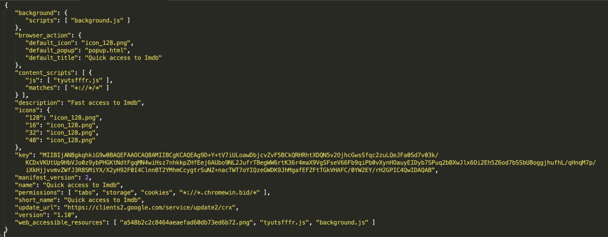 Here the permissions include cookies, the web_accessible_resources are a548b2c2c8464aeaefad60db73ed6b72.png , tyutsfffr.js, and background.js, and the content_script is tyutsfffr.js. The code which injects malicious code to a webpage is located in the file tyutsfffr.js.