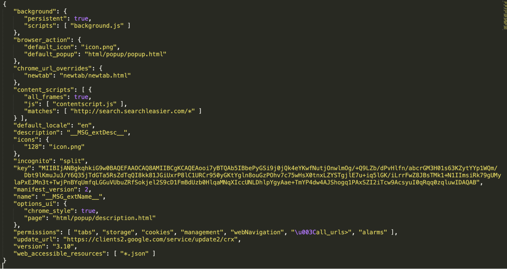 Figure 21 shows the manifest of one of these extensions. In this case, it uses “chrome_url_override” to replace the newtab.