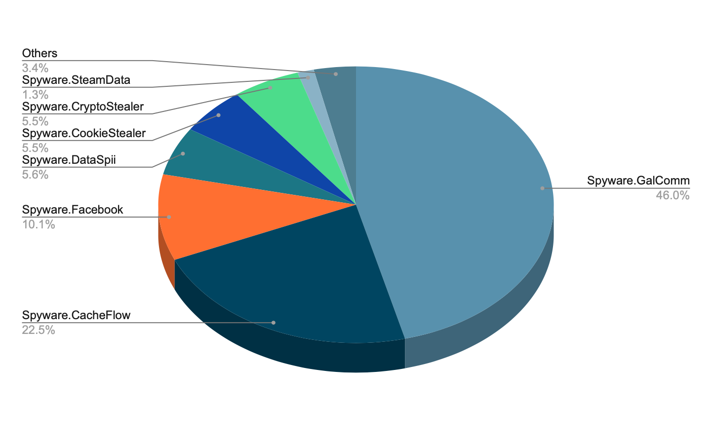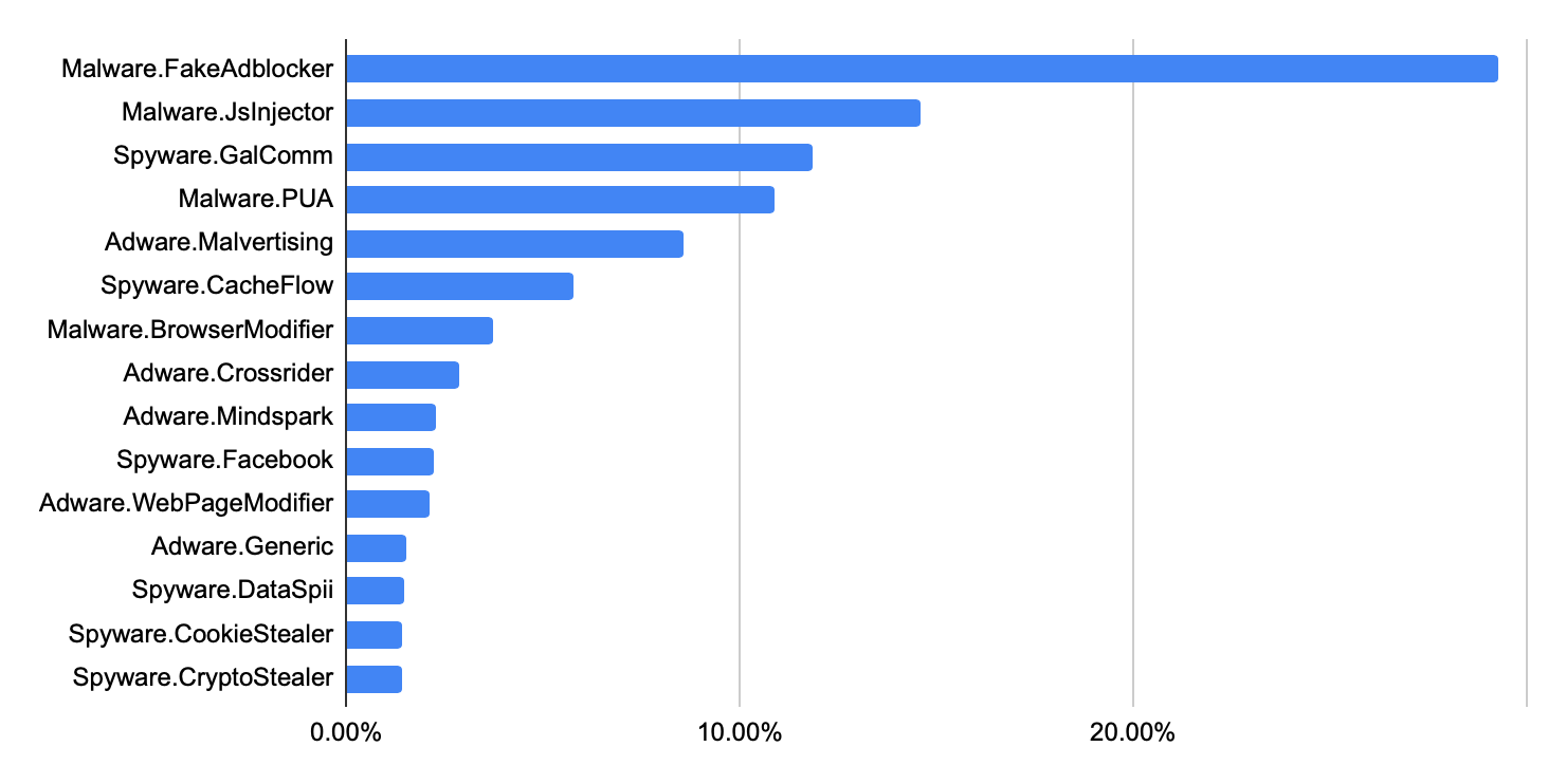 Adware and spyware account for the most common malware families, with 11 out of the top 15 discovered falling into one of those two. Other families were JavaScript Injectors, potentially unwanted applications (PUA), and Browser modifiers.