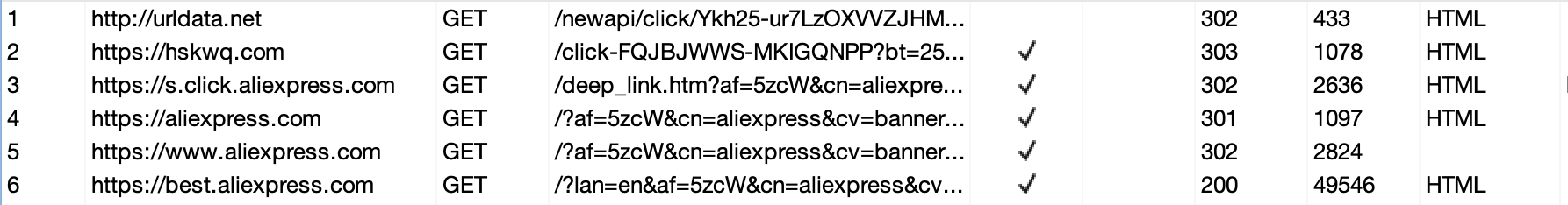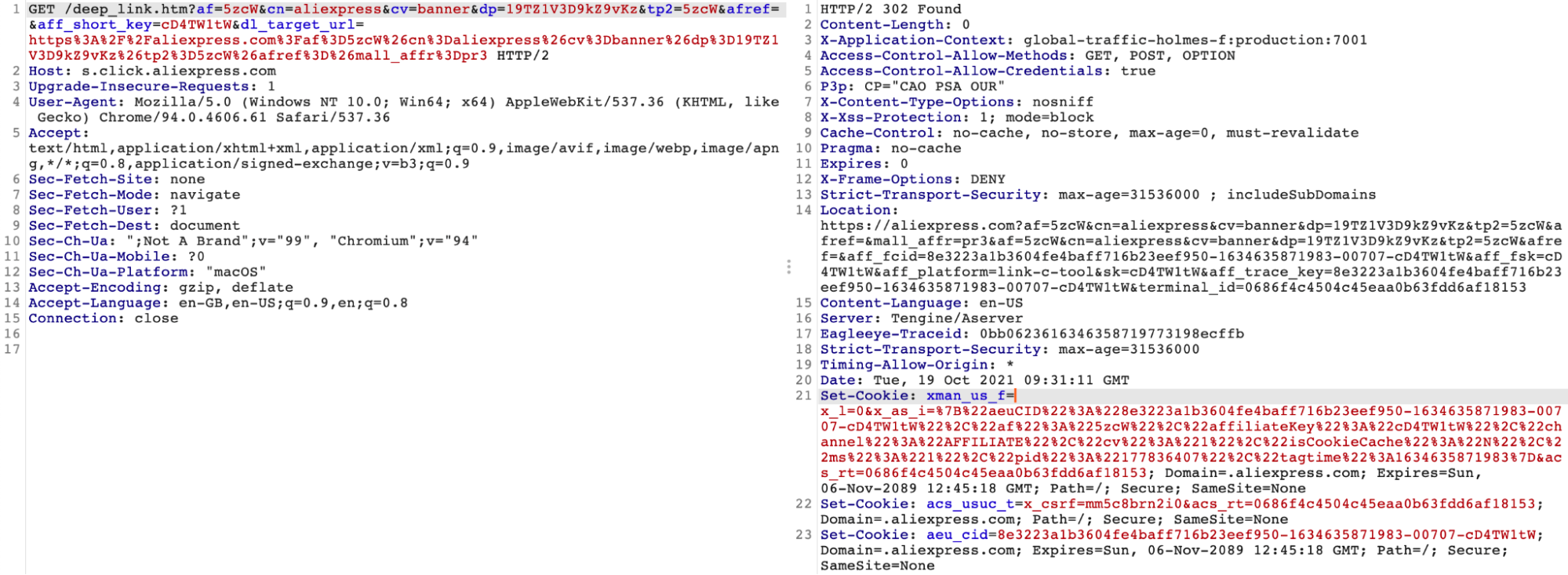 Figure 4 shows an example of a redirection chain and cooking stuffing for an extension targeting aliexpress.com. From a technical point of view, the affiliate cookies are dropped to the victim’s browser using the Set-Cookie response header in the HTTP request (Figure 5). If the user later visits the target website and completes a qualifying transaction (such as making a purchase), the malicious party is paid a commission.